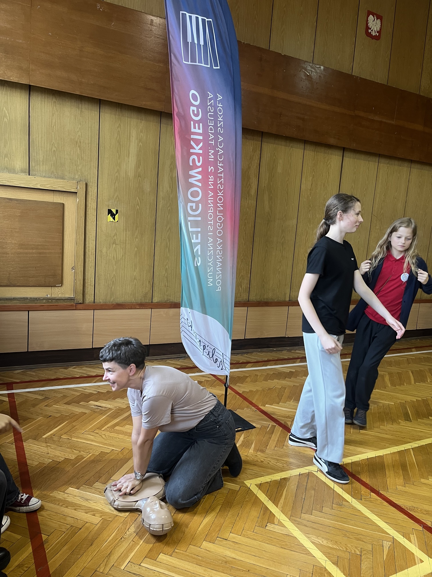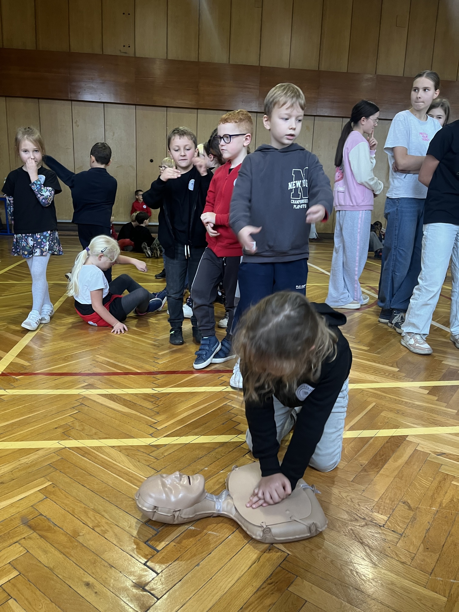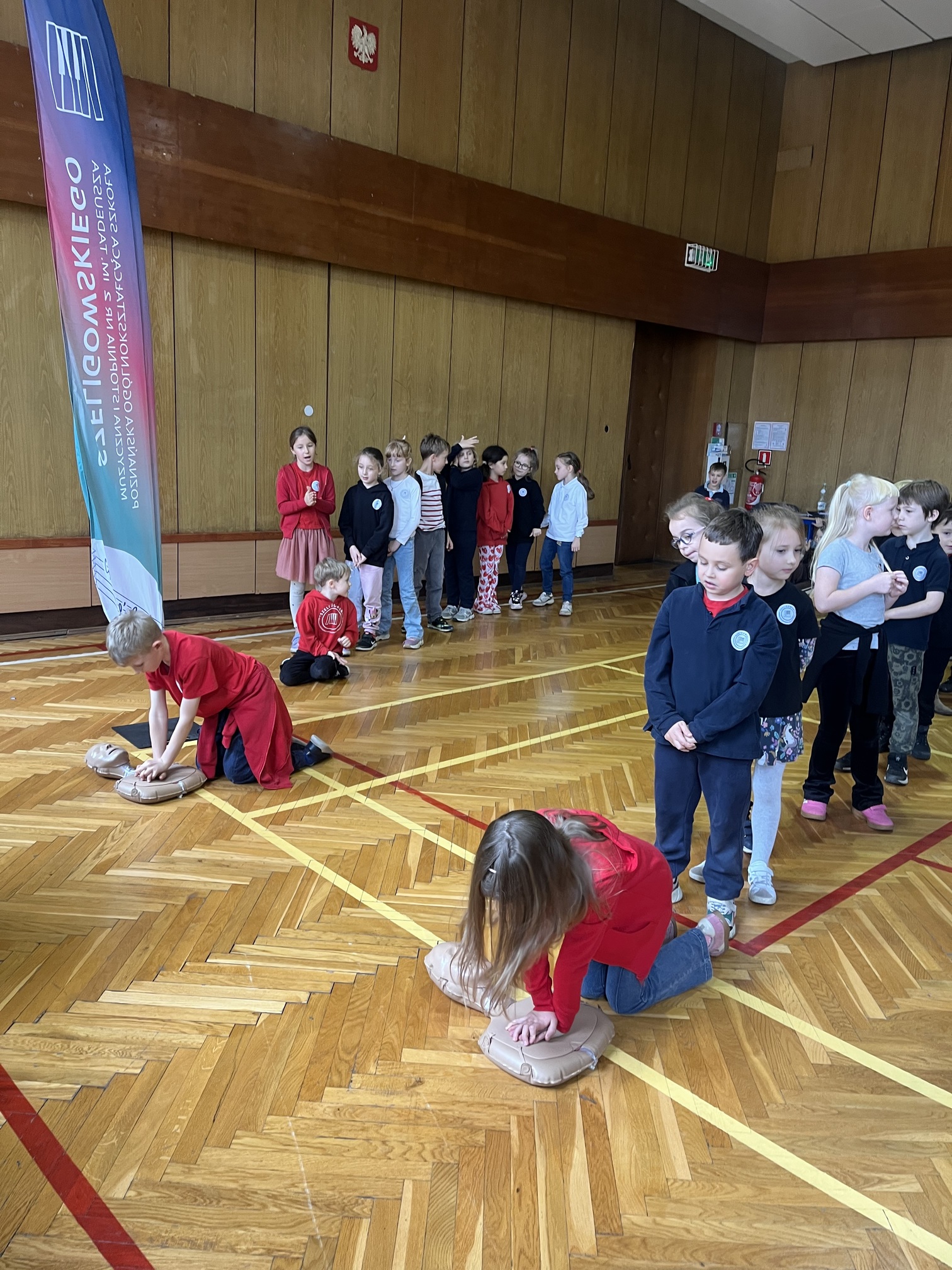 W naszej sali gimnastycznej zgromadziło się 160 osób – uczniów, nauczycieli, pracowników szkoły i zaproszonych gości – którzy wspólnie, przez 30 minut, prowadzili RKO na fantomach, pokazując, że potrafimy nie tylko się bawić, ale przede wszystkim ratować życie.