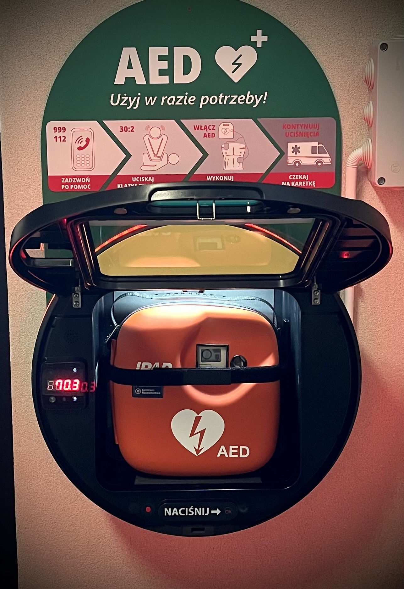 w przyszłości planujemy jego umieszczenie na zewnętrznej ścianie przy wejściu głównym. Właśnie otrzymaliśmy pozwolenie od Miejskiego Konserwatora Zabytków na instalację kapsuły z defibrylatorem.
