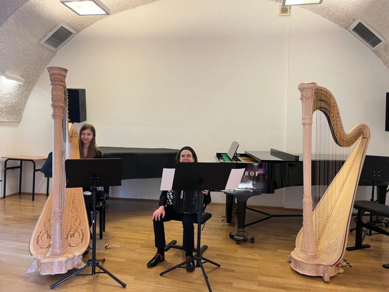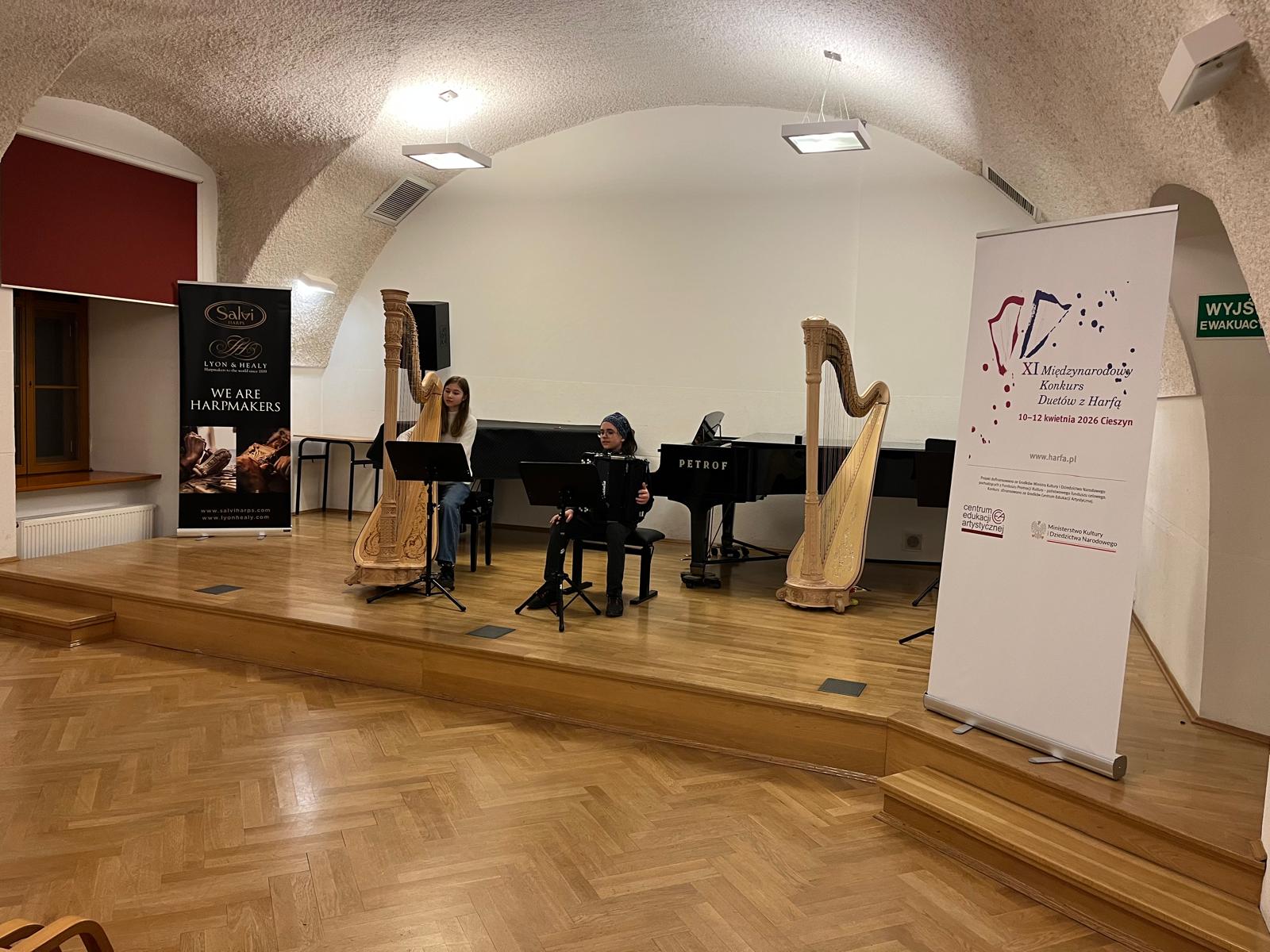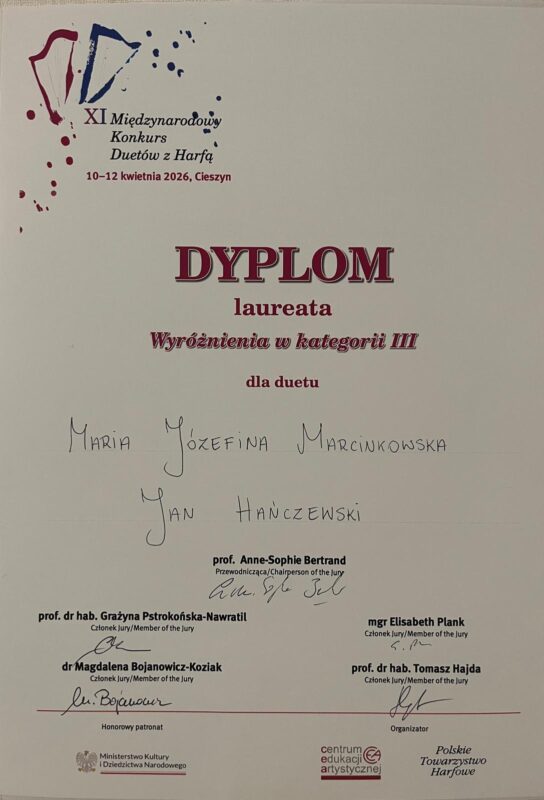 Już od piątku można było wsłuchiwać się w muzykę płynącą z zamkowego wzgórza. Gościnne mury cieszyńskiego zamku otwarły swe podwoje dla młodych muzyków chcących rywalizować w XI MIĘDZYNARODOWYM KONKURSIE DUETÓW Z HARFĄ organizowanym przez Centrum Edukacji Artystycznej i Polskie Towarzystwo Harfowe pod honorowym patronatem ministra kultury i dziedzictwa narodowego – Marty Cienkowskiej. Jest to wydarzenie cykliczne, zainaugurowane w 2005 roku, odbywające się co dwa lata. Tegoroczna edycja okazała się rekordowa pod względem zgłoszonych uczestników. Na zamkowej scenie swe umiejętności zaprezentowało ponad czterdzieści duetów! Wśród rzeszy młodych kameralistów znaleźli się także uczniowie naszej szkoły: grająca na harfie Maria Józefina Marcinkowska – z klasy VII, uczennica pani Anny Ciszyńskiej i akordeonista Jan Hańczewski – z klasy VIII, uczeń prof. ośw. Cezarego Witlewskiego. Duet, o wdzięcznej nazwie „MarJan Duo” powstał w tym roku szkolnym i jest prowadzony przez p. Annę Ciszyńską. Zarówno dla Marysi jak i Janka przystąpienie do Konkursu w Cieszynie było duetowym debiutem, na którym wspólnie zdobywali pierwsze konkursowe szlify. Nie było to proste zadanie, bowiem w swojej kategorii byli zdecydowanie najmłodszymi uczestnikami. Tym bardziej cieszy fakt, że utwory w ich wykonaniu bardzo spodobały się licznie zgromadzonej publiczności a znakomite, międzynarodowe Jury, doceniło interpretację i wrażliwość młodych artystów, wysoko punktując ich występ: