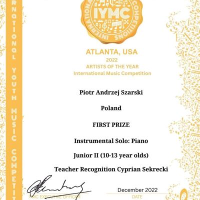 Ogromny sukces na internetowym Międzynarodowym Konkursie pianistycznym dla młodych artystów w Atlancie, USA – pierwsza nagroda oraz Drugie miejsce na 7 edycji Nouvelles Etoiles w Paryżu ( online ) bravo !