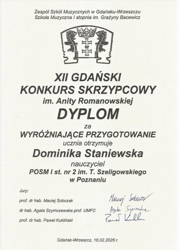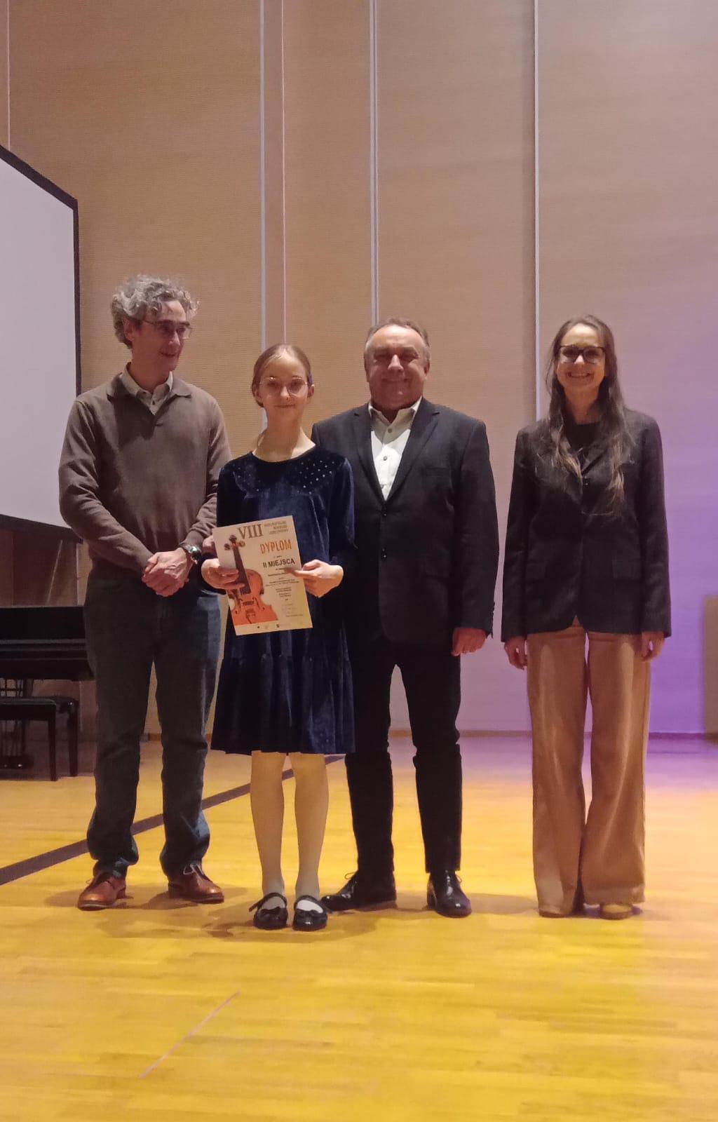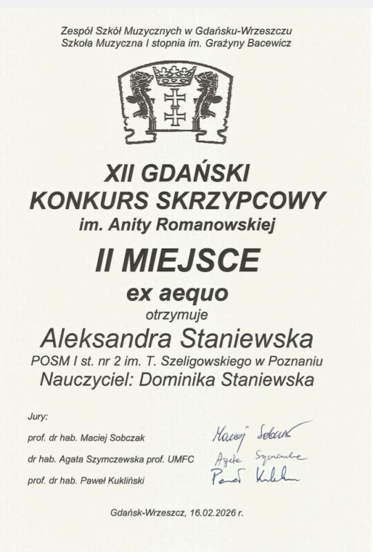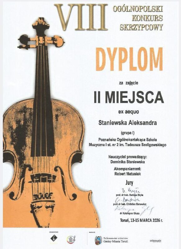 Zaledwie miesiąc później ponownie stanęła na podium, zdobywając II nagrodę w VIII Ogólnopolskim Konkursie Skrzypcowym w Toruniu (13-15.III.2026). Konkurs ten słynie z wysokiego poziomu co czyni sukces jeszcze bardziej imponującym.