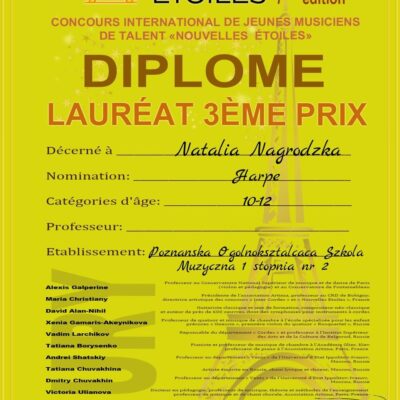 Pod koniec stycznia młoda harfistka została laureatką TRZECIEJ nagrody w Międzynarodowym Konkursie Muzycznym Nouvelles Etoiles w Paryżu.