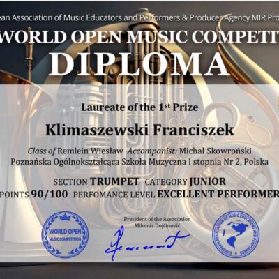 Franciszek Klimaszewski z klasy 2 w klasie trąbki 🎺, zajął I Miejsce w 14 WORLD OPEN MUSIC COMPETITION w Belgradzie.