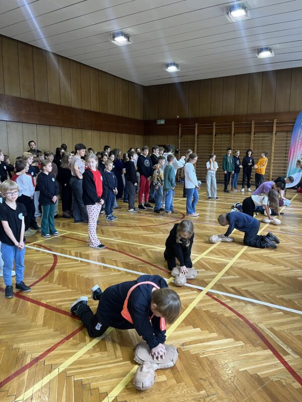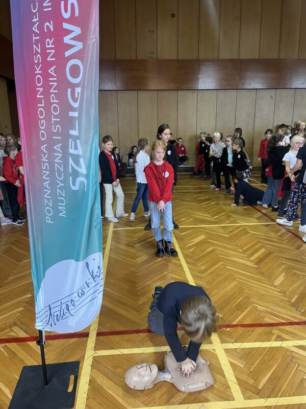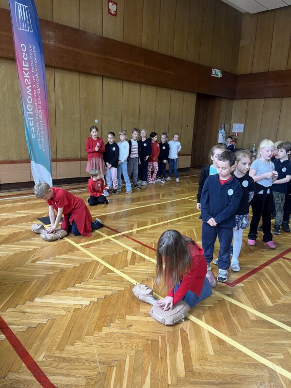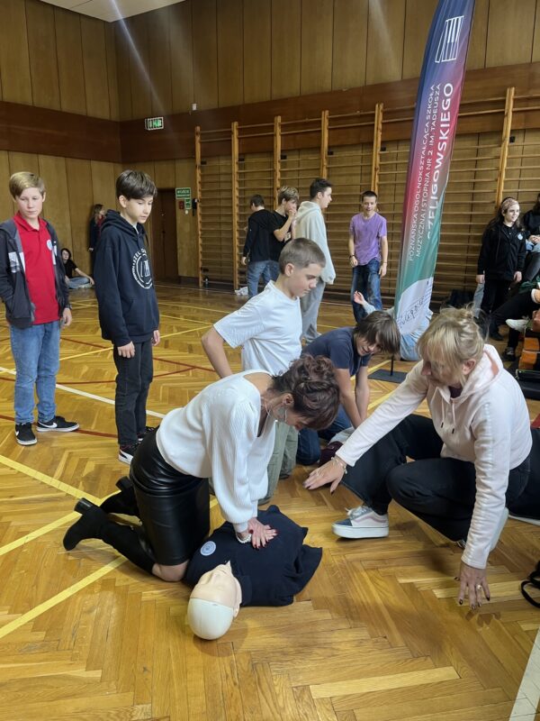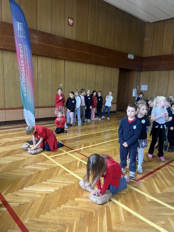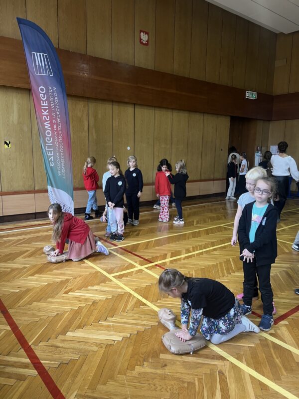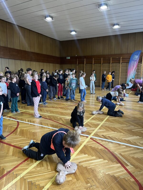 W naszej sali gimnastycznej zgromadziło się 160 osób – uczniów, nauczycieli, pracowników szkoły i zaproszonych gości – którzy wspólnie, przez 30 minut, prowadzili RKO na fantomach, pokazując, że potrafimy nie tylko się bawić, ale przede wszystkim ratować życie.